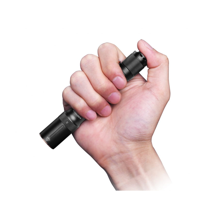 Latarka waży 42 g, co sprawia, że jest praktycznie niezauważalna podczas noszenia. Moletowana powierzchnia zapewnia pewny chwyt, a odłączany stalowy klips umożliwia mocowanie na pasie, plecaku lub w kieszeni.
