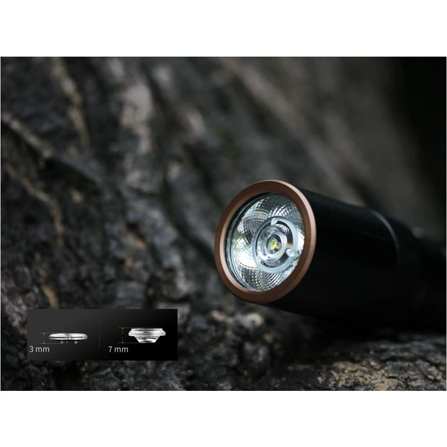 Zastosowana soczewka kolimacyjna Al + UV o grubości zaledwie 3 mm i kącie świecenia 85° minimalizuje straty światła, gwarantując równomierną iluminację. Tryb eco (1 lm) umożliwia dyskretne oświetlenie i pracę do 200 godzin.