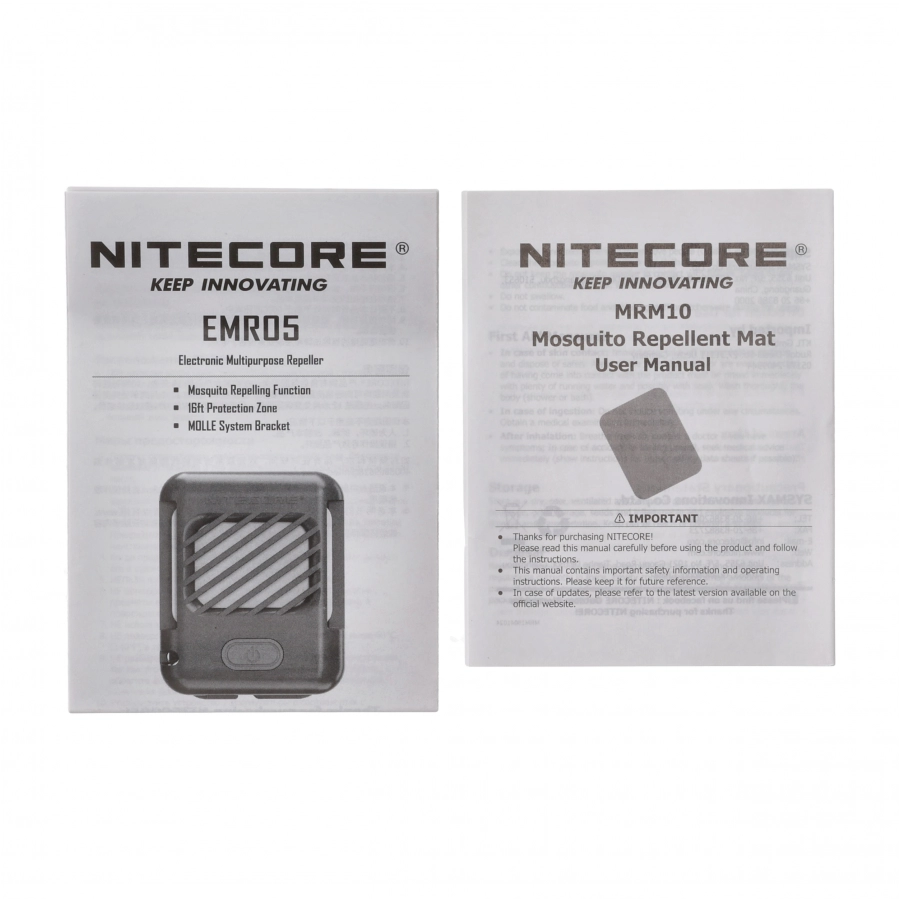 | Nitecore EMR10 Lite | 5 | Komarami, Gryzoniami, Wężami, Skunksami, Karaluchami | Tak | 12 | 167 × 60 × 33,5 | 135 | Ultradźwięki, powerbank, odporność na upadki do 1 m | ||||||
