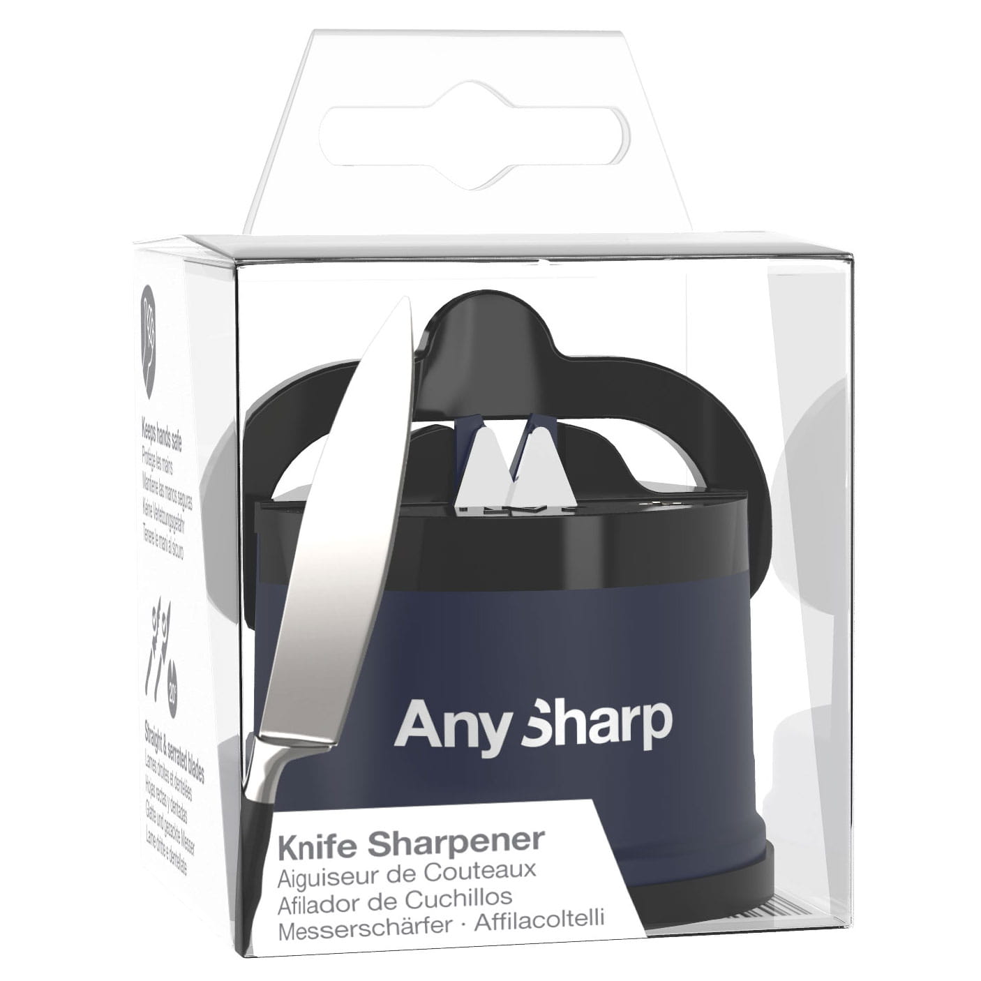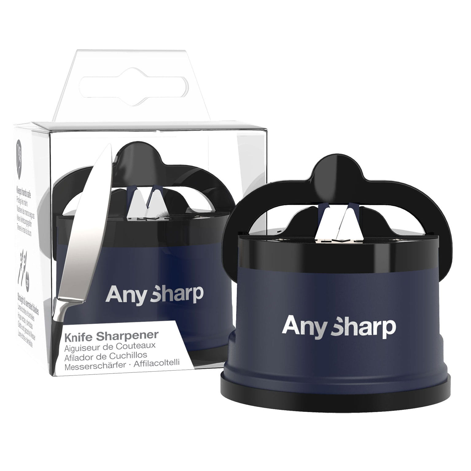 Bardzo skuteczna i prosta w obsłudze ostrzałka do noży. Sekretem ostrzałek AnySharp® są trójkątne płytki ostrzące wykonane z węglika wolframu, który jest niezwykle wytrzymałym materiałem, powstałym wskutek syntezy metalicznego wolframu i węgla w temperaturze do 2000 °C. Twardość tego materiału jest porównywana do diamentu czyli najtwardszego materiału na Ziemi. Właśnie z tego powodu skrawanie ostrza noża jest możliwe i efektywne. Płytki w całości zostały wykonane z węglika wolframu dzięki czemu przewyższają konkurencję żywotnością. Ostrzałka jest wyposażona w gumową przyssawkę z dźwignią PowerGrip®, która zapewnia stabilizację i bardziej precyzyjny proces ostrzenia. Ostrzałka ma prostą konstrukcję z wykończeniem w kolorze granatowym.