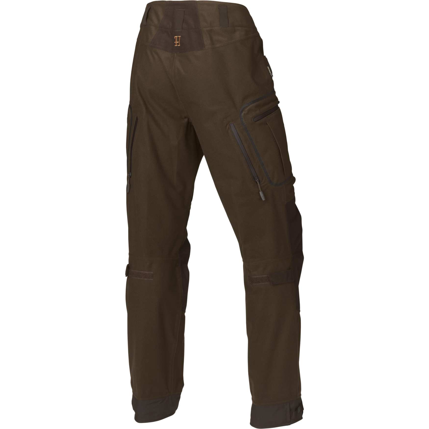 Spodnie Härkila Mountain Hunter wykonano z cichego, szczotkowanego trykotu. Materiał jest wzmocniony wytrzymałym materiałem Cordura® w kostkach. Spodnie są wiatro i wodoodporne dzięki oddychającej membranie GORE-TEX. Tkanina jest również impregnowana DWR- są odporne na brud i wodę. Wewnątrz spodnie posiadają siateczkową podszewkę odprowadzającą wilgoć. Spodnie Härkila Mountain Hunter mają dwie kieszenie na udach z wodoodpornymi zamkami, a w prawej kieszeni uchwyt na naboje. Posiadają nylonowe paski do regulacji przy kostkach i za kolanami. Po lewej stronie pasa znajduje się D-ring do mocowania różnych elementów wyposażenia. Z tyłu ud mają podszyte siatką otwory wentylacyjne z wodoodpornymi zamkami.