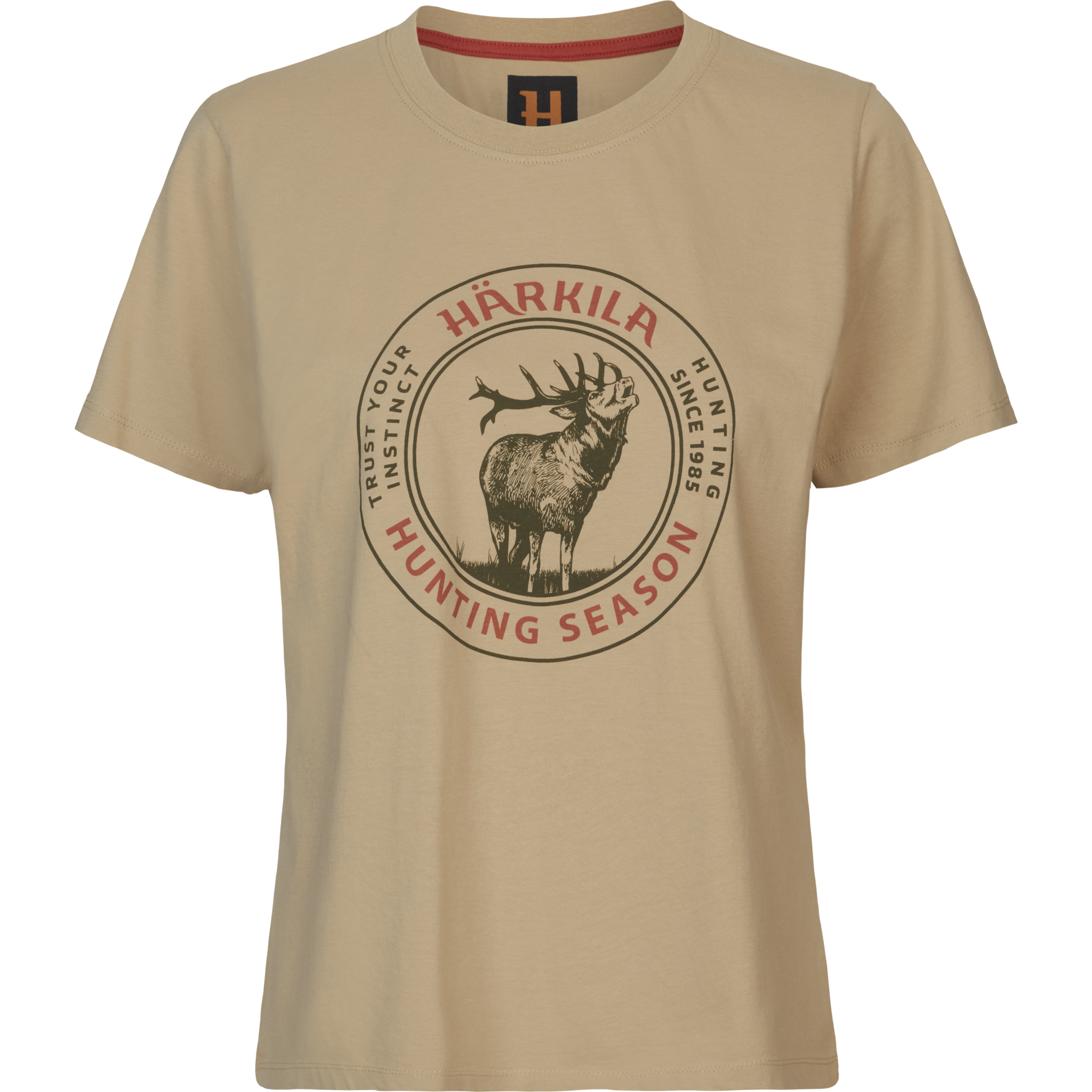Na przodzie koszulki znajduje się duży nadruk z logo Härkila Stag Badge.